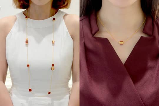 金豬牌、黃金頸鍊有「連生貴子」寓意,係襯裙褂嘅必然首選,但就真係名符其實「婚禮限定」,用於日常打扮配襯嘅可能性實在係0%。唔想金頸鍊塵封保險箱不見天日,不妨考慮圖中呢條黃金配紅瑪瑙長頸鍊,迷你正方體串飾可愛時尚,婚禮當日配上圓領敬酒晚裝及旗袍,有格調又有特色,平日返工襯one piece 淨色連身裙,就已經好優雅。