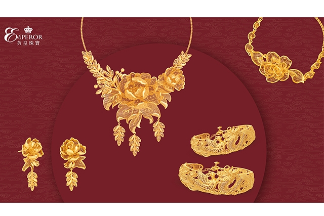 英皇珠寶「英龍皇鳳」婚嫁金飾為傳統注入創新靈感,將精湛工藝與現代設計完美結合,既保留傳統特色之外,又能展現時尚東方韻味。利用5D立體浮雕技術,將傳統工藝提升至嶄新層次,配合立體鏤空工藝勾勒呈祥之姿,呈現活靈活現的龍鳳造型,讓「金龍」精緻吸睛,「金鳳」柔美典雅,以金詠愛,象徵著龍鳳和合,打造出質感出眾的完美金飾。