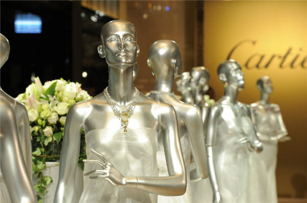 模特兒又演示多件去年在巴黎古董雙年展令人驚嘆的作品﹕卡地亞為現代女性重新演繹了1920年代為一位印度王子製作的鉑金項鏈,改動後的造型設計以一顆三角形刻面梨印度鑽石為主石,再以玫瑰切割鑽石作點綴。至於以鉑金鑲鑽的珠寶,則閃耀出大自然優雅的氣質,加上腕錶作綴飾更顯高貴。