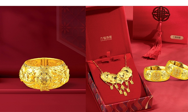 長輩們一般鍾情傳統的款式,龍鳳鈪及金豬牌是不可或缺的。龍鳳和鳴,代表著百年忠貞愛情的美好寓意,將龍與鳳雕刻於鐲身,象徵新人以喜開啟新生活,願喜事伴龍而來,幸福乘鳳而至。萌趣金豬造型的項鏈取「豬」福之意,黃金豬牌上鐫刻「囍」字,身下牽多隻福氣小豬,蘊含將喜氣傳承的美好祝願,送予新人也傳遞多子多褔、兒孫滿堂的心意。