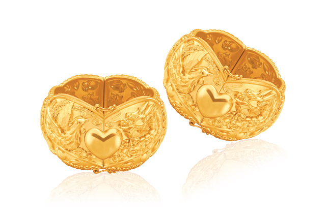 龍鳳手鈪是中式婚嫁中最受歡迎的金飾,盛載了長輩和親人對新人的祝福 ,寓意婚後福澤綿延、榮華富貴,而英皇珠寶的龍鳳手鈪揉合傳統與時尚,雕花立體細緻,龍鳳鈪上飾有龍鳳、祥雲、如意、雙喜、百福,更加入了時下新人喜愛的元素,例如同心就代表婚後同心同德,家興業旺,生活幸福美滿!
