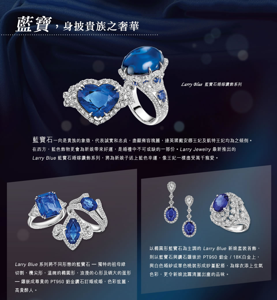 Larry Blue系列將不同形態的藍寶石 – 獨特的祖母綠切割、欖尖形,溫婉的橢圓形,浪漫的心形及碩大的蛋形 – 鑲嵌成尊貴的PT950鉑金鑽石訂婚戒婚,色彩炫麗,高貴醉人。