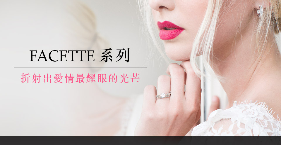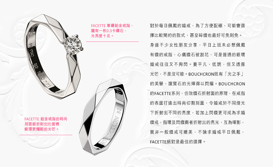 身邊不少女性朋友分享,平日上班未必想佩戴有鑽的戒指,心痛鑽石被刮花,可是普通的銀環婚戒往往又不夠閃。 要平凡、低調,但又透露光芒,不是沒可能。 Bouchcron既有「光之手」的美譽,讓寶石的光輝得以閃耀。Bouchcron的Facette系列,仿效鑽石折射面的原理,在戒指的表面打造出時尚切割刻面,令婚戒於不同燈光下折射出不同的亮度,若加上閃鑽更可成為求婚鑽戒,指環及閃鑽兩者折射出的亮光,互為暉影,實非一般鑽戒可媲美,不論求婚或平日佩戴,Facette絕對是最佳的選擇。