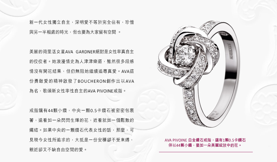 美麗的荷里活女星Ava Gardner絕對是女性率真自主的佼佼者。她浪漫情史為人津津樂道,雖然很多段感情沒有開花結果,但仍無阻她繼續追尋真愛。Ava這份勇敢愛的精神啟發了Boucheron創作出以Ava 為名,歌頌新女性率性自主的Ava Pivoine戒指。