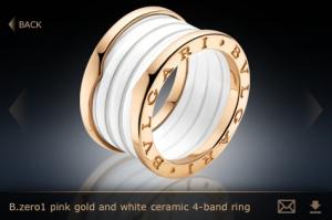 最近Bulgari透過iPhone app推出一個多姿多采的3D空間,讓大家可以盡情瀏覽整個Bulgari經典B.zerol珠寶系列,其中包括Anish Kapoor 設計的精鋼混合玫瑰金打造的特別被戒指,以及採用黑色或白色陶瓷與玫瑰金打造的新款戒指。