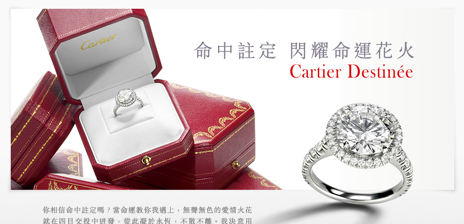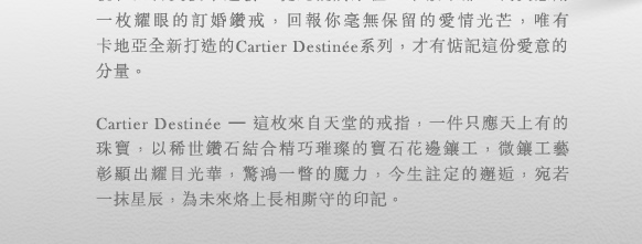 你相信命中註定嗎?當命運教你我遇上,無聲無色的愛情火花就在四目交投中迸發,從此凝於永恆,不散不離。我決意用一枚耀眼的訂婚鑽戒,回報你毫無保留的愛情光芒,唯有卡地亞全新打造的Cartier Destinée系列,才有惦記這份愛意的分量。Cartier Destinée – 這枚來自天堂的戒指,一件只應天上有的珠寶,以稀世鑽石結合精巧璀璨的寶石花邊鑲工,微鑲工藝彰顯出耀目光華,驚鴻一瞥的魔力,今生註定的邂逅,宛若一抹星辰,為未來烙上長相廝守的印記。