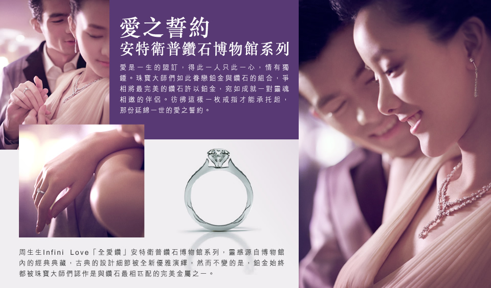 周生生Infini Love「全愛鑽」安特衛普鑽石博物館系列,靈感源自博物館內的經典典藏,古典的設計細節被全新優雅演繹,然而不變的是,鉑金始終都被珠寶大師們認作是與鑽石最相匹配的完美金屬之一。
