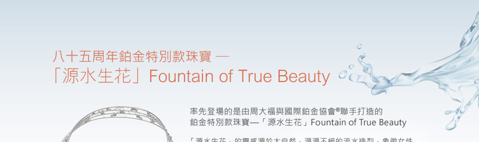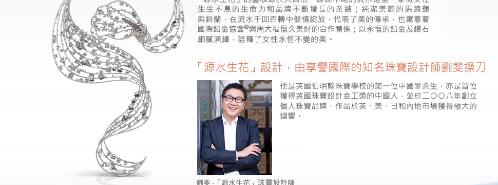「源水生花」的靈感源於大自然,源源不絕的流水造型,像徵女性 生生不息的生命力和品牌不斷增長的業績;純潔美麗的馬蹄蓮 與鈴蘭,在流水千回百轉中傾情綻放,代表了美的傳承,也寓意着 國際鉑金協會與周大福恒久美好的合作關係;以永恒的鉑金及鑽石 細膩演繹,詮釋了女性永恒不變的美。」