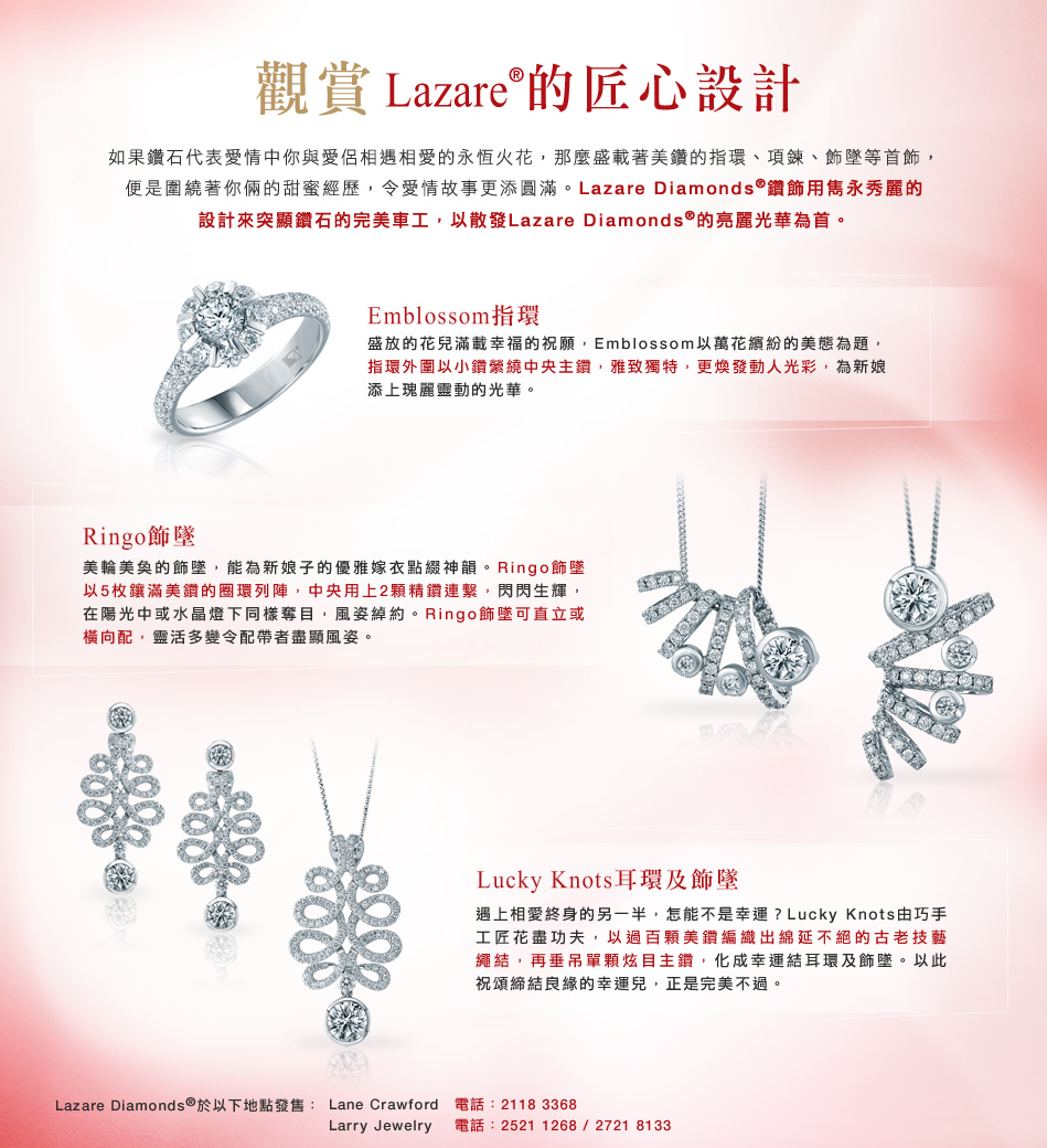 如果鑽石代表愛情中你與愛侶相遇相愛的永恆火花,那麼盛載著美鑽的指環、項鍊、飾墜等首飾,便是圍繞著你倆的甜蜜經歷,令愛情故事更添圓滿。Lazare Diamonds®鑽飾用雋永秀麗的設計來突顯鑽石的完美車工,以散發Lazare Diamonds®的亮麗光華為首。 Emblossom指環 盛放的花兒滿載幸福的祝願,Emblossom以萬花繽紛的美態為題,指環外圍以小鑽縈繞中央主鑽,雅致獨特,更煥發動人光彩,為新娘添上瑰麗靈動的光華。 Ringo飾墜