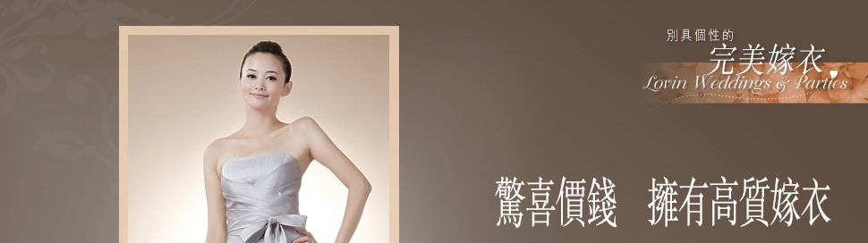 浪漫的婚禮、純潔優雅的婚紗,加上最愛的那個他,是每個女孩子心底最浪漫的憧憬。為了留住這個美麗回憶,準新娘往往走到中環區的高級婚紗店,花費數萬元訂製嫁衣。其實妳有更好選擇,因為Lovin Weddings & Parties以簡約為原則,提供婚禮禮服訂造、設計及租售服務,為新娘設計出清麗脫俗的婚紗,毋須花費數萬元,妳都能得到媲美中環質素的高品質婚紗及晚裝。