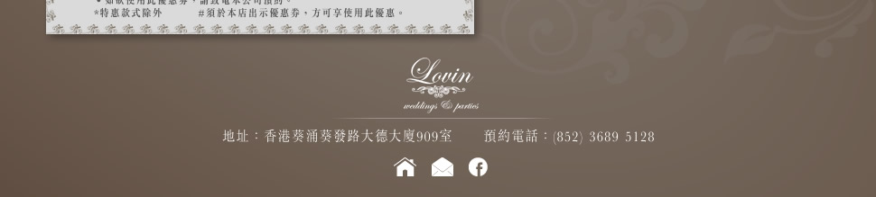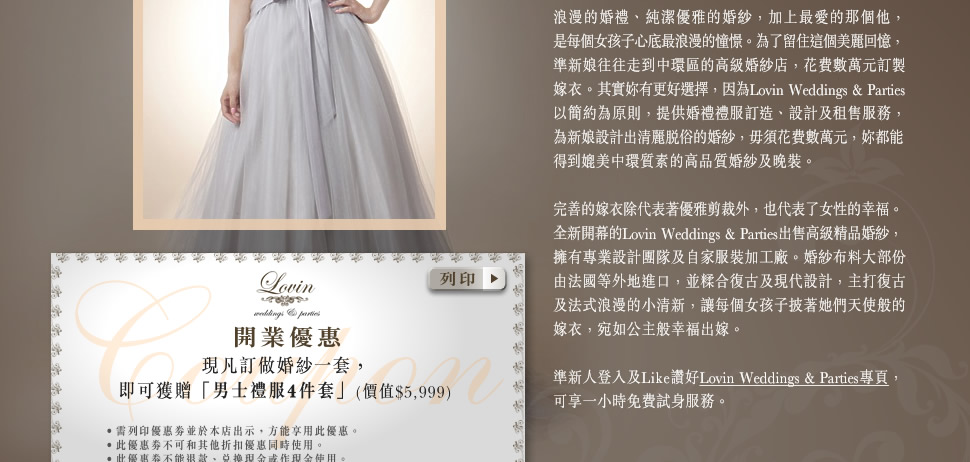準新人登入及Like讚好Lovin Weddings & Parties專頁,可享一小時免費試身服務。