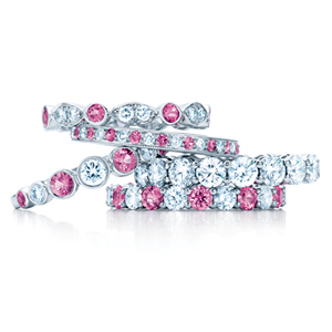 載著永恆承諾的鑽石戒指,一般都以閃鑽為材料,少有用其他顏色的鑽石來作配搭。在今個情人節,Tiffany & Co.推出"Love Is All Around"系列,以嬌艷奪目的粉紅色藍寶石配襯閃爍的美鑽,人手精心鑲嵌在鉑金戒指上。粉紅色的美鑽代表著完美欣悅的愛情,每顆鑽戒閃耀著經典時尚的風格,層疊起每一份珍貴璀璨的回憶。