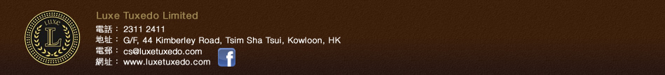 Luxe Tuxedo Limited 電話: 2311 2411 地址: G/F, 44 Kimberley Road, Tsim Sha Tsui, Kowloon, HK 電郵: cs@luxetuxedo.com 網址: www.luxetuxedo.com