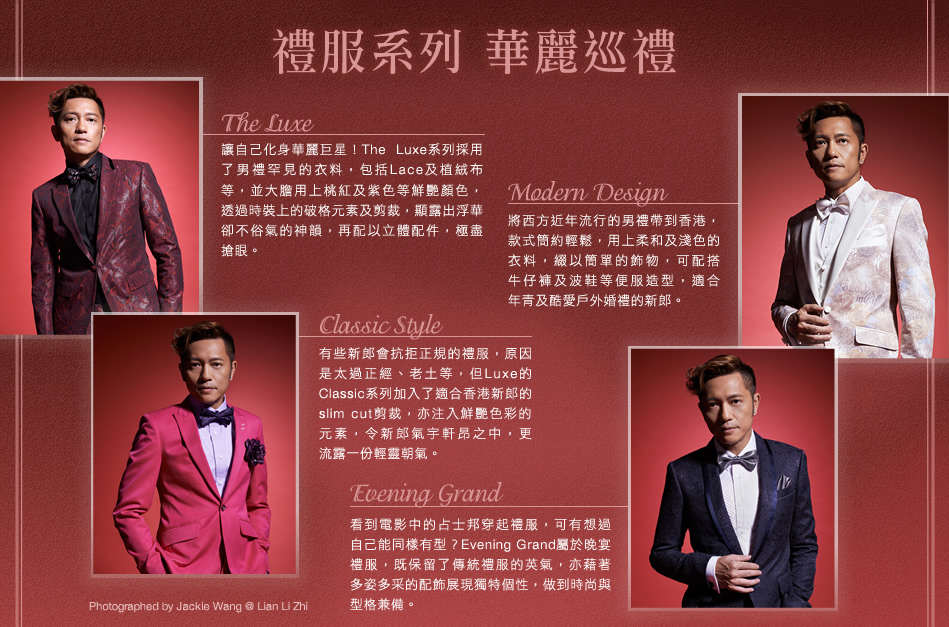 有些新郎會抗拒正規的禮服,原因是太過正經、老土等,但Luxe的Classic系列加入了適合香港新郎的slim cut剪裁,亦注入鮮艷色彩的元素,令新郎氣宇軒昂之中,更流露一份輕靈朝氣。 Evening Grand