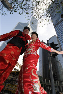其實在香港拍結婚照也可以很Playful。記得有一次,為專誠由倫敦回港的一對未婚夫婦拍攝Pre-Wedding 照片。我選擇了人口最密集的銅鑼灣做拍攝場地,中午時份,兩人穿上紅紅的中式唐裝及龍鳯裙褂,於SOGO門外人車爭路的馬路上,作出動感的動作。途人雖然議論紛紛,但臉上全部掛上艷羨及祝褔的笑容,登時為銅鑼灣增添了一份喜悅。
