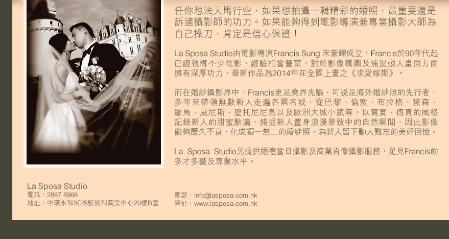 La Sposa Studio由電影導演Francis Sung 宋豪輝成立,Francis於90年代起已經執導不少電影,經驗相當豐富,對於影像構圖及捕捉動人畫面方面擁有深厚功力,最新作品為2014年在全國上畫之《求愛嫁期》。