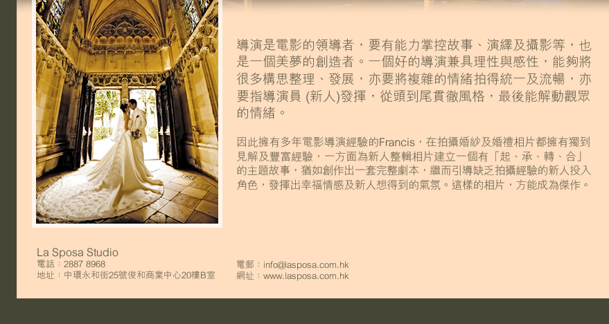 因此擁有多年電影導演經驗的Francis,在拍攝婚紗及婚禮相片都擁有獨到見解及豐富經驗,一方面為新人整輯相片建立一個有「起、承、轉、合」的主題故事,猶如創作出一套完整劇本,繼而引導缺乏拍攝經驗的新人投入角色,發揮出幸福情感及新人想得到的氣氛。這樣的相片,方能成為傑作。