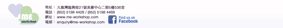 ME workshop 地址: 九龍灣臨興街21號美羅中心二期5樓536室 電話:(852) 5198 4428 / (852) 5198 4468 網址:www.me-workshop.com 電郵: enquiry@me-workshop.com
