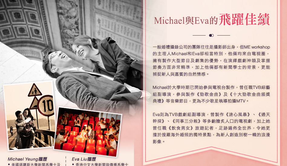 一般婚禮攝錄公司的團隊往往是攝影師出身,但ME Workshop的主理人Michael 和Eva卻相當特別,他倆均來自電視圈,擁有多年製作大型節目及劇集的優勢,在演繹戲劇神韻及掌握節奏方面非常精準,加上他倆都有新聞學士的背景,更能捕捉新人與嘉賓的自然情感。 Michael於大學時期已開始參與電視台製作,曾任職TVB綜藝組副導演,參與製作《勁歌金曲》及《十大勁歌金曲頒獎典禮》等音樂節目,更為不少歌星執導拍攝MTV。 Eva則為TVB戲劇組副導演,曾製作《溏心風暴》、《通天幹探》、《同事三分親》等多齣膾炙人口的電視劇,加上她曾任職《飲食男女》旅遊記者,足跡遍佈全世界,令她更擅於搜羅海外婚照的獨特景點,為新人創造別樹一幟的浪漫影像。