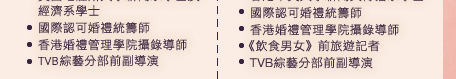 Michael Yeung履歷 美國堪薩斯大學新聞系學士及經濟系學士 國際認可婚禮統籌師 香港婚禮管理學院攝錄導師 TVB綜藝分部前副導演 Eva Liu履歷 香港中文大學新聞與傳播系學士 國際認可婚禮統籌師 香港婚禮管理學院攝影導師 《飲食男女》前旅遊記者 TVB戲劇分部前副導演