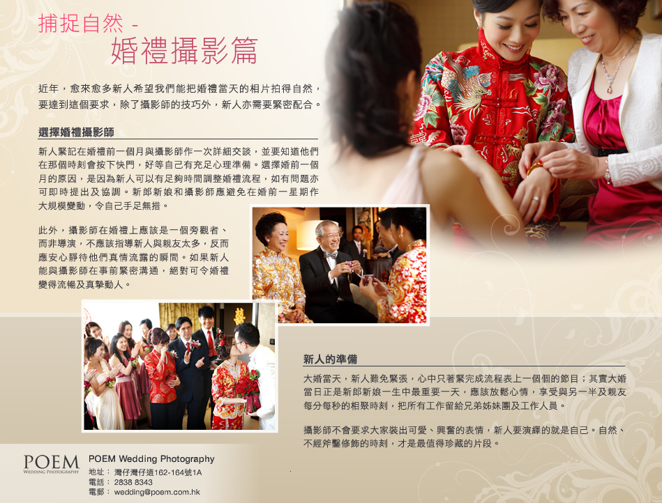 新人的準備 大婚當天,新人難免緊張,心中只著緊完成流程表上一個個的節目;其實大婚當日正是新郎新娘一生中最重要一天,應該放鬆心情,享受與另一半及親友每分每秒的相聚時刻,把所有工作留給兄弟姊妹團及工作人員。 攝影師不會要求大家裝出可愛、興奮的表情,新人要演繹的就是自己。自然、不經斧鑿修飾的時刻,才是最值得珍藏的片段。