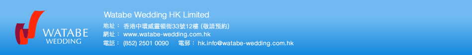 Watabe Wedding HK Limited 地址:香港中環威靈頓街33號12樓 (敬請預約) 電話:2501 0090 電郵:hk.info@watabe-wedding.com.hk 網址:www.watabe-wedding.com.hk