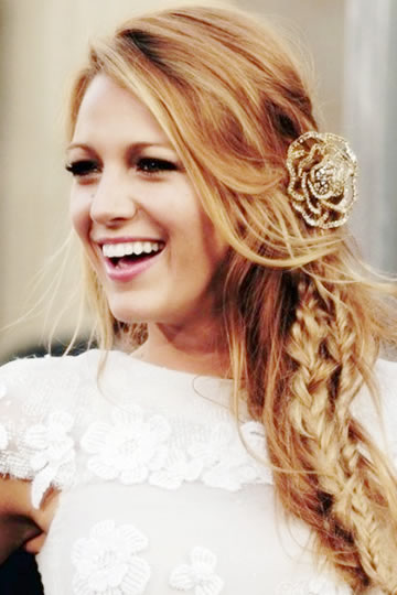 身為「花邊教主」的女主角 Blake Lively,當然時刻都要站在潮流尖端,連自己的婚禮也不例外。她以鬆散的 boho style 鬢辮配搭 "bling bling" 單朵花飾髮夾,清麗脫俗,又不失貴氣。