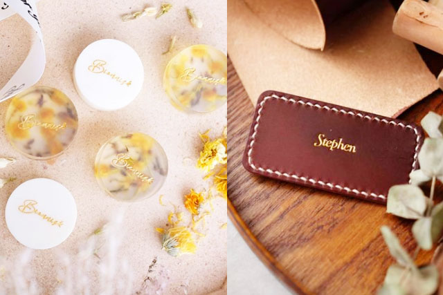 除此以外,Biennis 玥⾒⼯作室亦會在婚禮上為賓客提供即場壓印名字的服務攤位,讓來賓也能帶走擁有專屬名字的禮物,最受歡迎的產品有⽪⾰、⼿⼯皂、乾花蠟牌,定價為HK$40至$200 起,視乎款式數量⽽定。