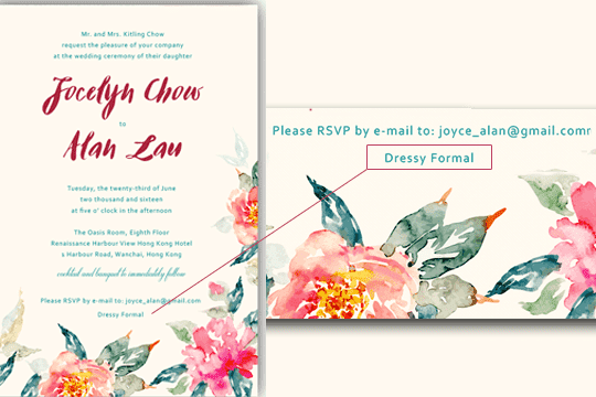 婚禮上只有新娘子會穿白色,所以不能穿白色禮服或裙裝參加婚禮應該是基本常識吧!另外,紅色雖然是中國喜慶顏色,但新娘一般會穿全紅的裙褂、敬酒晚裝亮相,如果你不想成為全場被討論的焦點,請一定不要穿全紅或全白的造型,除非新娘有特別指定Dress Code,如果妳真的很喜歡白色的話,可以試試米色或者拼搭其他顏色。至於全黑的造型,不用多說都知道是喪禮的服飾,結婚是開心的事情,就沒有必要穿一身黑吧!