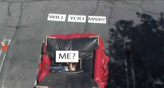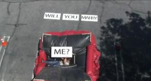 妳最嚮往的求婚方法又是哪一種呢﹖在美國有位男士向拍拖4年的女友求婚,上演驚心動魄的一幕,在片中該及男子危站在天台的橫壆上,在場有多名友人一同見證他求婚的時刻,他向大家說﹕「我想是時候問女友一條重要的問題了﹗」隨後叫朋友給他拋上戒指,但他接不住連人帶戒指一同墜樓,嚇得原本笑得甜絲絲的女友馬上變臉衝上前大叫,原來男友早在樓下設置了救生墊,「安全著陸」後更大舉"Will you marry me?"的牌子,女友見愛人安全,始才露出笑容,旁邊一早知悉計劃的友人則哈哈大笑,這樣瘋狂求婚,加上一顆閃亮的戒指,女主角當然馬上答應了﹗