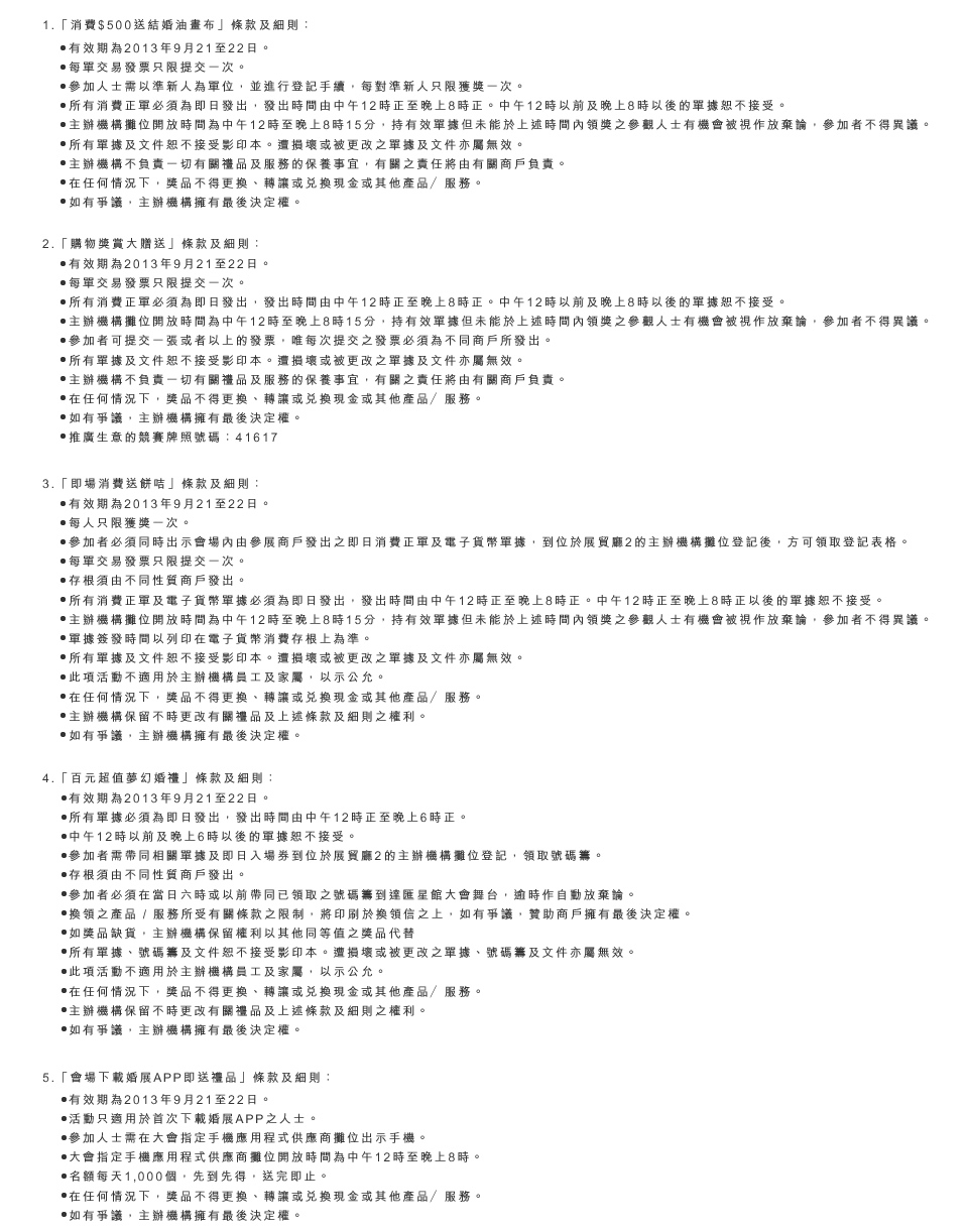 凡在場內購物或落單港幣$500或以上,憑即日會場內消費的發票,可到主辦機構攤位換領由新視覺數碼制作公司贊助之結婚油畫布一份,每對準新人只限獲獎一次,名額每天500個,先到先得。