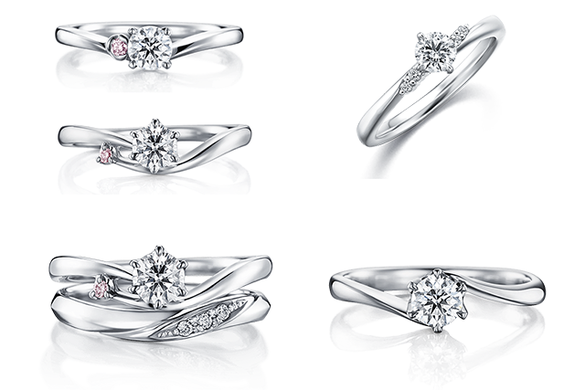 例如取材自處女座星宿的求婚鑽戒「SPICA」(上),與波浪設計結婚對戒「LUCINA」(下)組合配戴,人氣極高,戴上手有如在指尖上起舞。