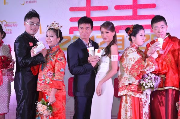 圖一:嘉賓謝婷婷和安志杰一同與各對愛侶以汽水「合巹交杯」。