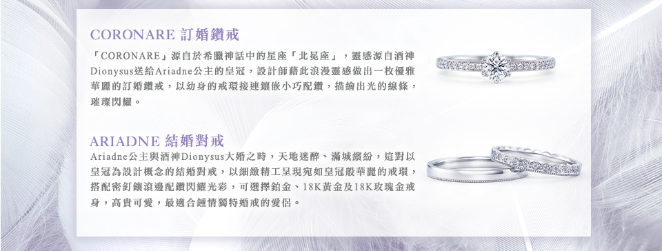 「CORONARE」源自於希臘神話中的星座「北冕座」,靈感源自酒神Dionysus送給Ariadne公主的皇冠,設計師藉此浪漫靈感做出一枚優雅華麗的訂婚鑽戒,以幼身的戒環接連鑲嵌小巧配鑽,描繪出光的線條,璀璨閃耀。
