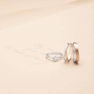 恆.諾 ETERNAL Promise 婚戒套裝(圖二),對戒以白色、玫瑰色黃金與鑽石的交叉設計,代表兩人幸福「無限」。求婚鑽戒可與婚戒疊戴,象徵二人以緊密相連的心、相牽的手,走到白頭。