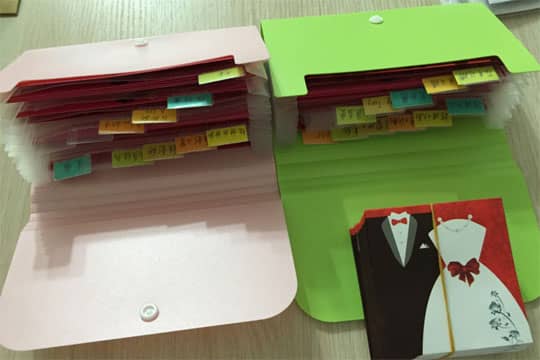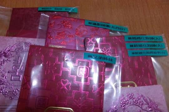 除了用上不同款式的利是封,風琴包可算是新人必備小物。很多新人都會準備兩色風琴包,新娘、新郎各保管一個,並在不同格數放入各銀碼利是,自然一目了然,一般文具店及淘寶有售。