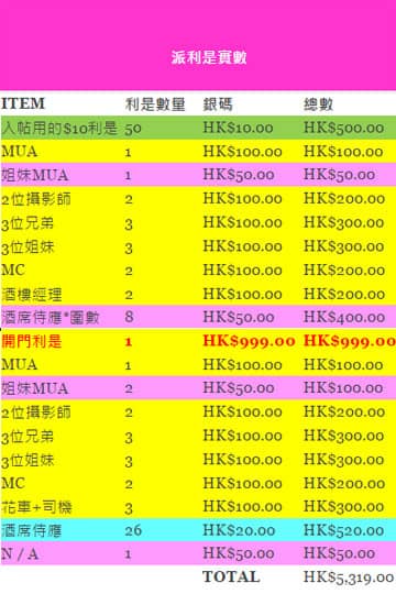 | 婚禮工作人員 | 數量 | 利是金額 | 合計 |
