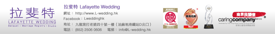 拉斐特 Lafayette Wedding 網址:http://www.L-wedding.hk Facebook:Lweddinghk 地址:九龍窩打老道四十號一樓(油麻地港鐵站D出口)