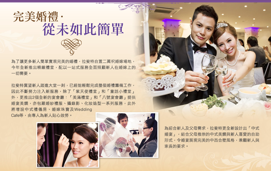 為了讓更多新人簡單實現完美的婚禮,拉斐特自置二萬呎婚嫁場地,今年全新推出精緻禮堂,配以一站式服務全面照顧新人在婚嫁上的一切需要。 拉斐特冀望新人踏進大堂一刻,已經能輕鬆完成整個婚禮籌備工作,因此不斷努力注入新服務,除了「紫天使禮堂」和「童話小禮堂」外,更推出2個全新的宴會廳:「美滿禮堂」和「八號宴會廳」提供婚宴美饌,亦包羅婚紗禮服、攝錄影、化妝造型一系列服務,此外將增設中式禮儀房、婚嫁珠寶及Wedding Cafe等,由專人為新人貼心效勞。 為迎合新人及父母需求,拉斐特更全新設計出「中式婚宴」,結合父母推崇的中式美饌與新人喜愛的自助形式,令婚宴展現完美的中西合壁風格,兼顧新人與家長的要求。