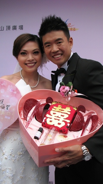 完成證婚後,恒隆地產助理董事關則輝亦聯同陳豪,為新人送上精緻心形結婚禮盒,包括兩套G.O.D.雙囍餐具系列及圍裙、山頂廣場獨有的洋紫荆花香薫油、以及獨立刻有新人名字的Silversmith自家設計玫瑰花,令二人婚姻生活更甜蜜。大會更為陳豪多預備了一個結婚禮盒,寓意祝福他和女友可以早日共諧連理,他對記者表示,日後要辦婚禮就要特別些,例如是水底婚禮、或是Sky Dive也是考慮之列。