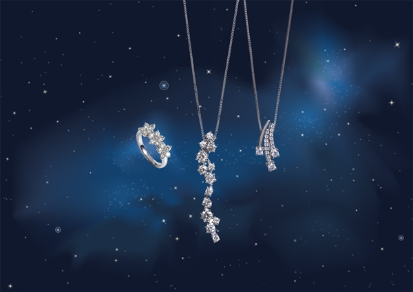 「花閃閃」系列則以香港市花洋紫荊為焦點,設計師在洋紫荊呈心形的五片圓花瓣上鑲以閃亮鑽石,以雙花及三花造型雕琢出吊墜和戒指,更添清麗氣質。而「星閃閃」系列則以東方之珠為題,以閃耀的鑽石代表璀璨的香港。其中呈流蘇形的星星吊墜形態優美,用來配襯修身剪裁的晚裝更顯優雅。