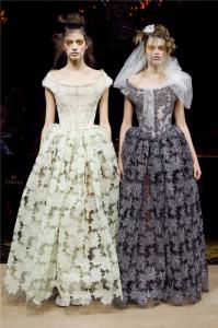 2012春季的 Vivienne Westwood Gold Label系列Lace晚裝,肩膊以Off the shoulder作為設計,與腰間的ball gown配搭得恰到好處,裙子長度離地一至兩吋,感覺很grand。以lace作為主要材料,突顯出vintage味道。