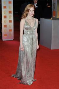 除了Vivienne Westwood之外,早前出席2012 BAFTA Awards的影星Jessica Chastain就穿上Oscar de la Renta Pre-Fall 2012 gown 全銀色Deep V晚裝亮相,亦是值得大家參考的晚裝之一。該套晚裝以銀色壓紋質料製造,看起來像流蘇,走起路來令準新娘更婀娜多姿,清雅奪目。領口Deep V剪裁,腰間以銀線束腰,展現出美好身段。