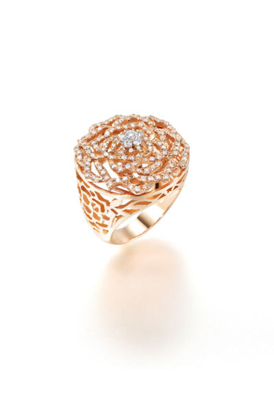 這種轉動的幸福,就如今季新品首飾一樣,可以自由旋轉的18K玫瑰金鑽石花瓣,配上由6顆美鑽鑲造的花芯,把愛情的甜蜜、結婚的喜悅都綻放出來,配合18K玫瑰金及白金鑽石旋轉吊墜,令新娘子穿起婚紗時,更添華麗氣質。
