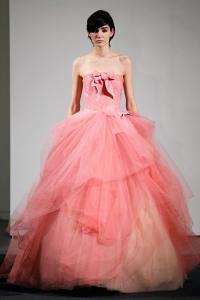 準備於 2014 年底結婚的新娘子,相信現在正密鑼緊鼓地尋找你的嫁衣吧!就讓我們帶你搶先預覽國際級婚紗設計師品牌 Vera Wang、Oscar de la Renta 及 Marchesa 2014 年的最新創作,買不買也是其次,但至少讓你腦海中有幅「最理想嫁衣藍圖」,及至自己到婚紗店看見琳瑯滿目的婚紗時,都可以清晰知道心底裡最想要些甚麼,不會花多眼亂,越看得多、越難作決定。繼春夏季的黑色婚紗之後,2014 年秋冬,婚紗女王 Vera Wang 再次大膽向傳統宣戰,以粉紅色系為婚紗調色,令人再次拍案叫絕。大家都知道,大紅大紫一向是中國傳統的喜慶色調,不知道今趟 Vera Wang 是無心還是有意地迎合中國市場,當紅調婚紗一出,隨即在國內婚界引起哄動,不少內地的新娘子都渴望訂造一襲紅色婚紗。看來 Vera Wang 於國內的人氣,都會跟其秋冬季的婚紗色調一樣,越走越紅!