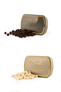 如果另一半經常隨身攜帶鐵盒裝口香糖的話,那麼,在求婚當日可嘗試找機會偷龍轉鳳,乘機把另一半手袋裡的口香糖鐵盒換成 agnès b. DÉLICES 朱古力珍珠脆豆鐵盒 (圖三),當然勿忘把鑽戒藏在鐵盒內!朱古力珍珠脆豆共有六種口味供選擇,除最受歡迎的黑朱古力及牛奶朱古力之外,還有白朱古力及士多啤梨口味,相信一定有一款合另一半心意。