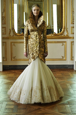 首先要介紹的,就是時裝界大師Alexander McQueen,雖然他已經離我們而去,不過他的傳奇作品依然令人愛不釋手,除了設計超凡時裝,他亦有設計婚紗系列,在他的婚紗作品裡,看到不一樣的時裝潮流元素,例如金色的羽毛般的企領外套,裹著白色的婚紗裙,很有「滿城盡戴黃金甲」的效果。或許您會覺得金光閃閃的外套很誇張,不適合在婚禮上穿著,不過說明是「後現代創意婚紗」,確實有他過人之處。