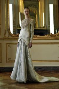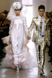 再來就是Chanel的款色,我覺得這套婚紗及禮服都很誇張,婚紗的頭飾本身已經很突出,加上由手袖至肩膀都以通花點綴,其餘的部份是輕巧的絲質覆蓋,後面是層層疊疊的拖尾,整個感覺既時尚又溫柔,配搭上銀色手套及鞋子,又帶出點點硬朗的味道,造成很有趣的對比。而男士禮服方面,淺金色的搶眼程度沒Alexander McQueen的那麼誇張,不過反光的質地又把眾人的眼光都驟到新郎身上,很聰明而又不過火的搶眼方法,不讓新娘子專美。