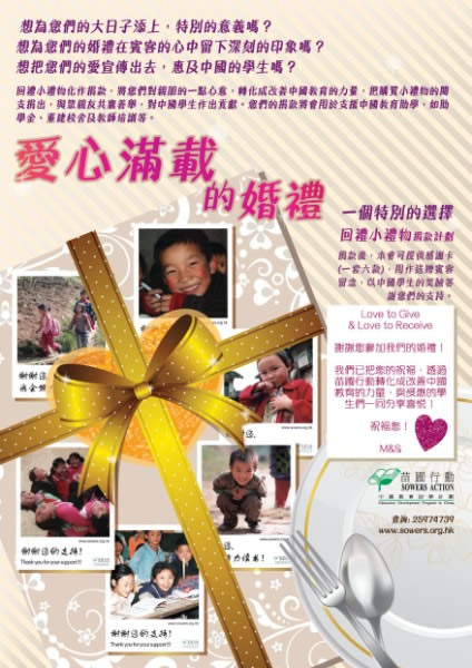 終於搵返張單張啦~係苗圃行動既捐款計劃,係上年既婚展時見到佢地既展示位係一套六款既感謝卡. 而我都打咗去問大約詳情,最重要係捐幾多款有幾多張! 回覆係: 100張捐款額要hkd1100,200張捐款額hkd1600...