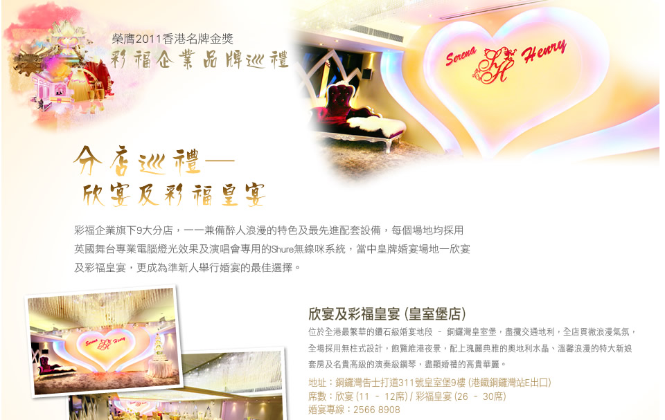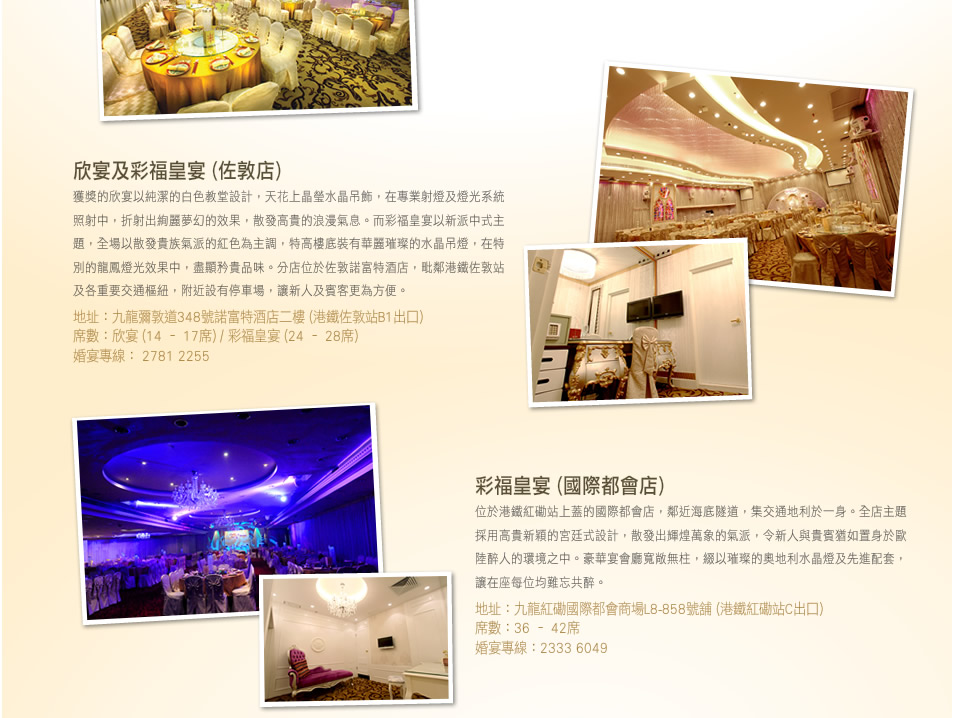 獲獎的欣宴以純潔的白色教堂設計,天花上晶瑩水晶吊飾,在專業射燈及燈光系統照射中,折射出絢麗夢幻的效果,散發高貴的浪漫氣息。而彩福皇宴以新派中式主題,全場以散發貴族氣派的紅色為主調,特高樓底裝有華麗璀璨的水晶吊燈,在特別的龍鳳燈光效果中,盡顯矜貴品味。分店位於佐敦諾富特酒店,毗鄰港鐵佐敦站及各重要交通樞紐,附近設有停車場,讓新人及賓客更為方便。